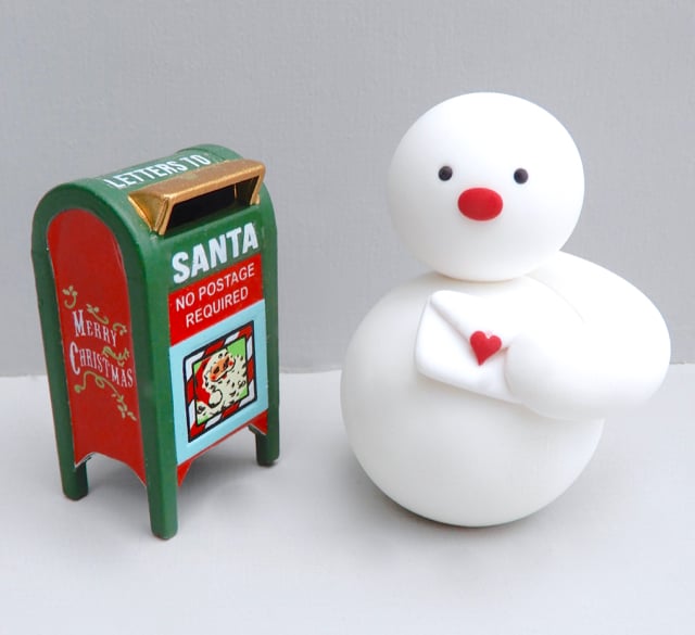 A snowman is mailing off a child’s Letter to Santa. The mailbox is metal, the snowman made from polymer clay. As it incorporates an item that I have not made, I am not able to sell it at my shows as all crafts must be made 50% or more by hand.